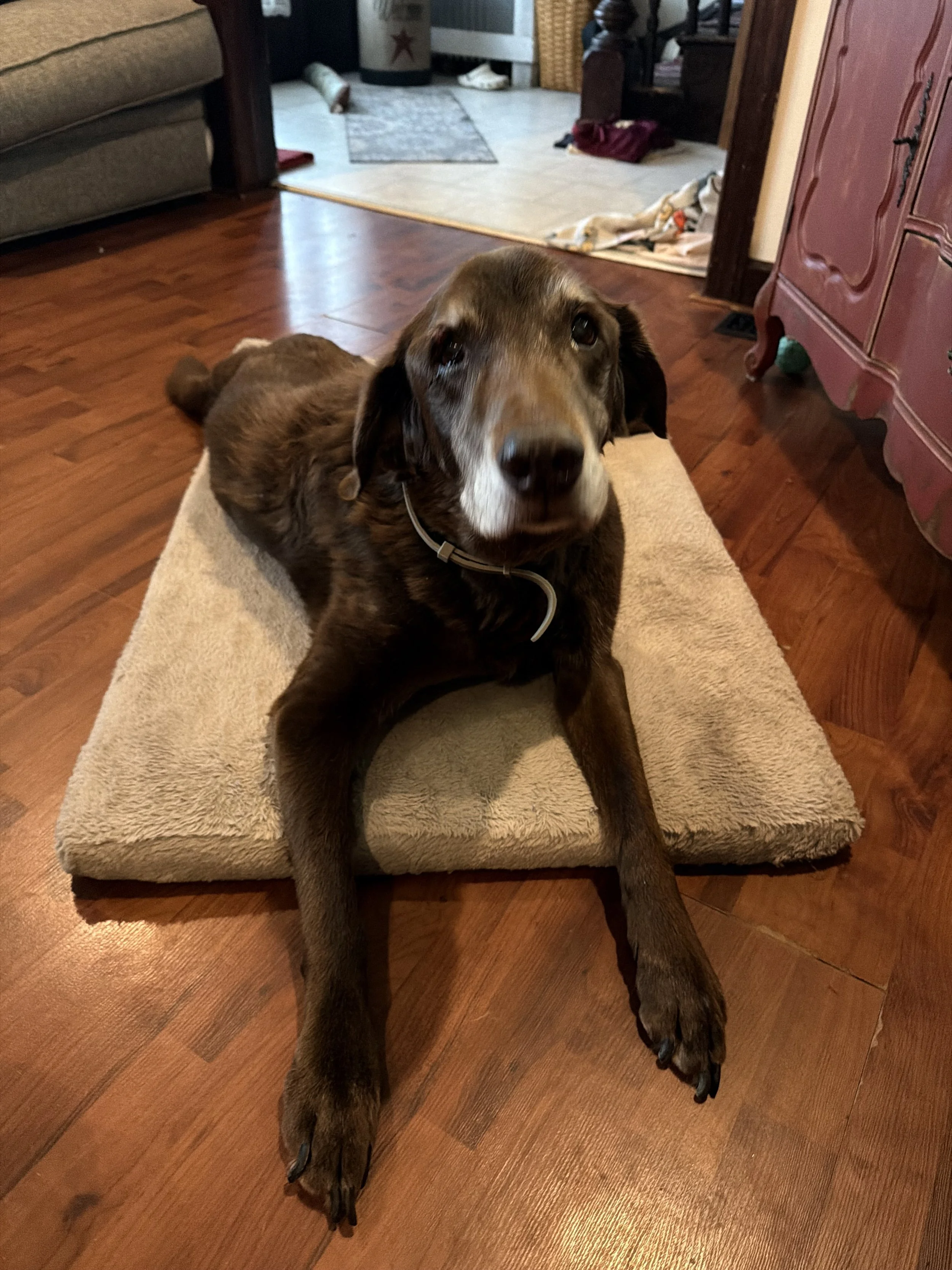 He walked freely on our 8 acres, never leaving our side. (Except for the skunk incident.) He would lean on us, placing his head on our laps. He loved cuddling with Sierra and our grandpuppy Boomer. He loved his frozen Kong and would demand it at 8:00 every evening. He was content. Loving. Sweet. Funny.