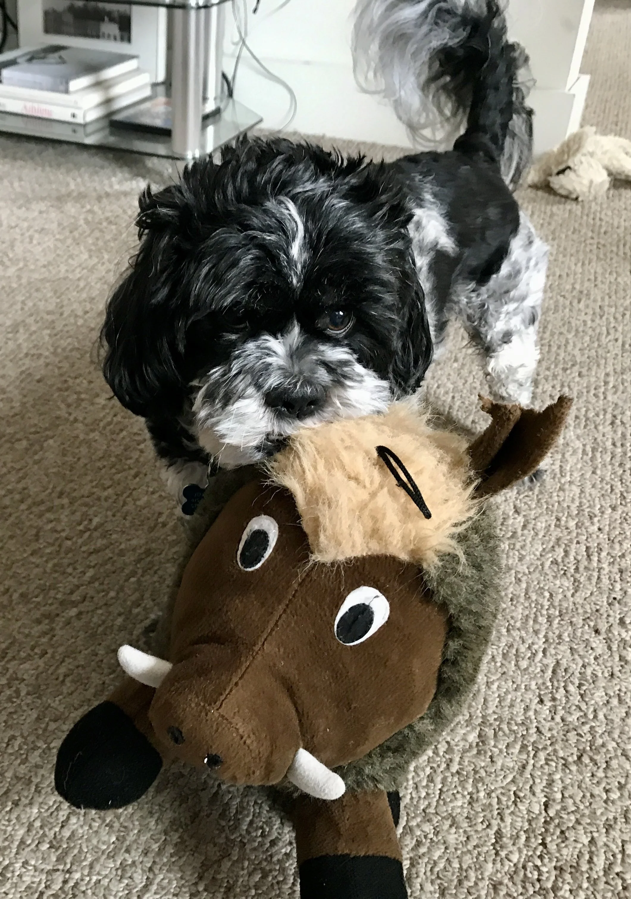 He was our built-in alarm system, always on duty to protect his family, and never missed a chance to greet (or challenge!) the mailman, Amazon delivery, or UPS guy. Leo adored his toys—his vampire bat, eyeball, turtle, and teddy bear were his treasures—and his signature little tongue, always sticking out, stayed with him right up to his final breath.